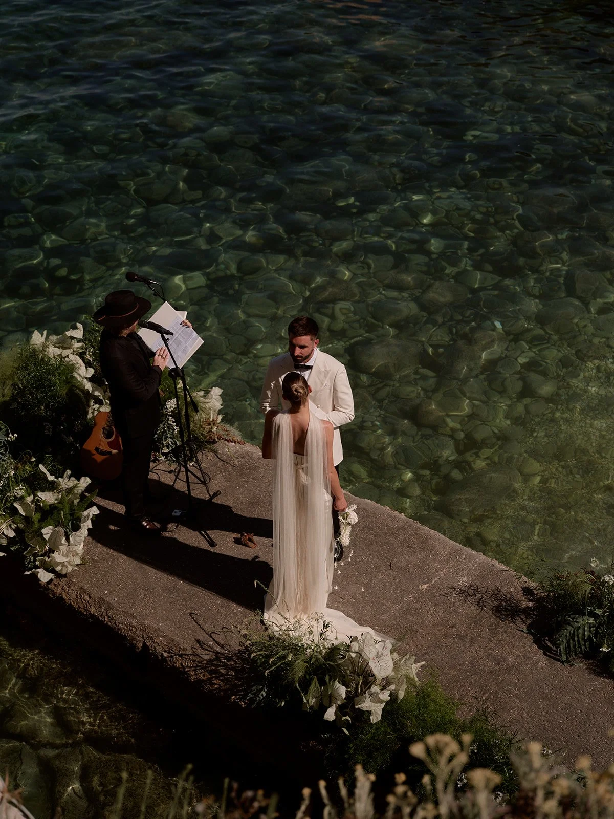 As with all our weddings, the goal was to let each part of the day feel distinct—building energy and anticipation until the party. The ceremony mirrored the flow of the sea, with florals and music designed to echo the water’s movement. Later, the atmosphere shifted: a live band in full swing, Meg & Olly grabbing the mics, limoncello flowing, and tiramisu served in shells.