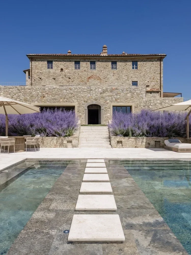 Complete privacy with panoramic Tuscan views, outdoor and indoor pools, spa facilities, pizza oven, and elegant event spaces.