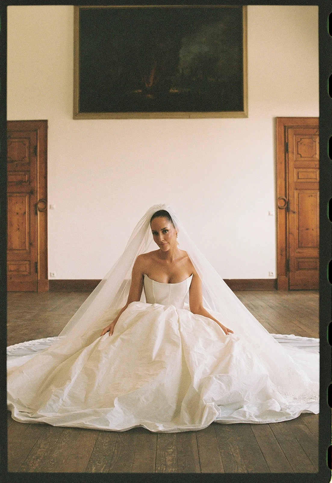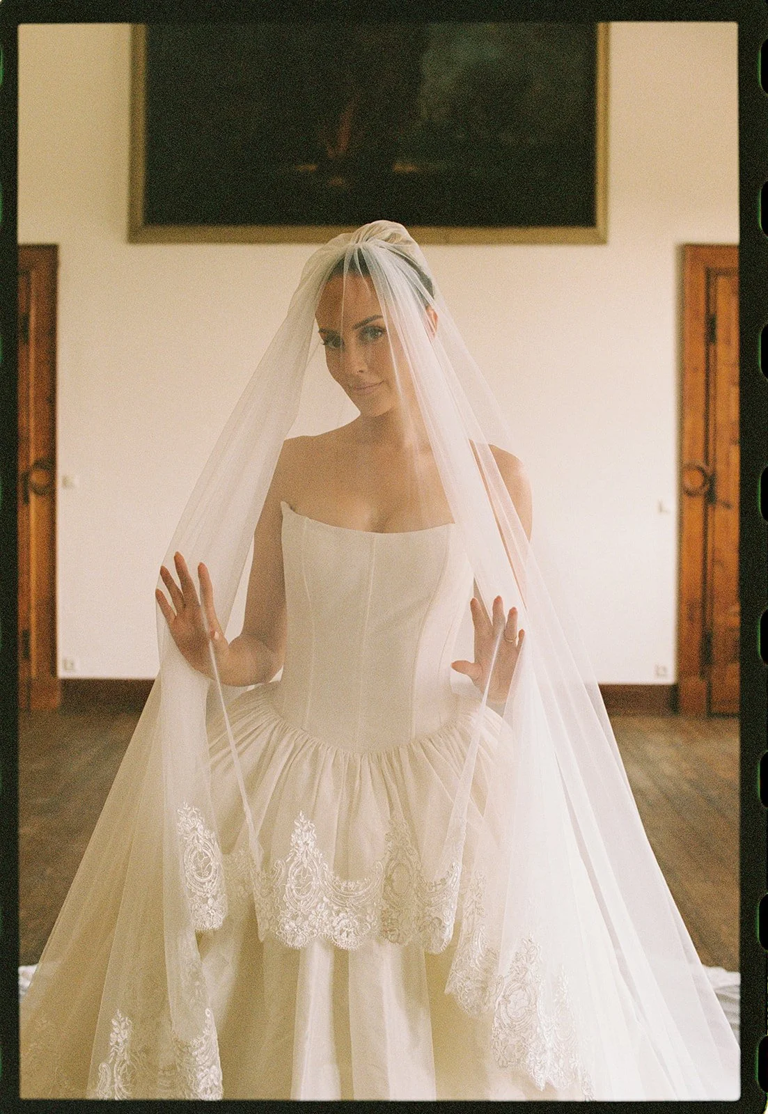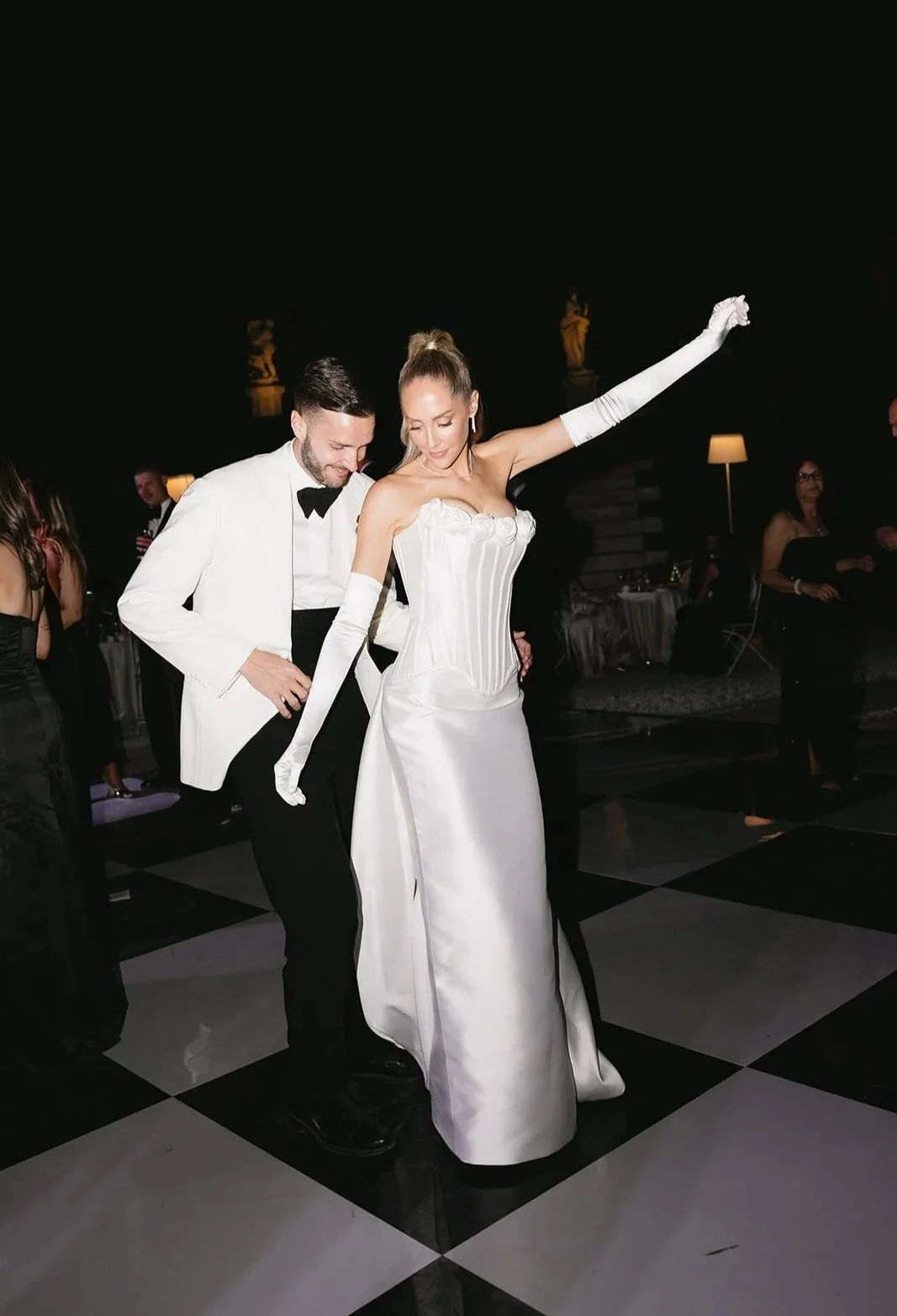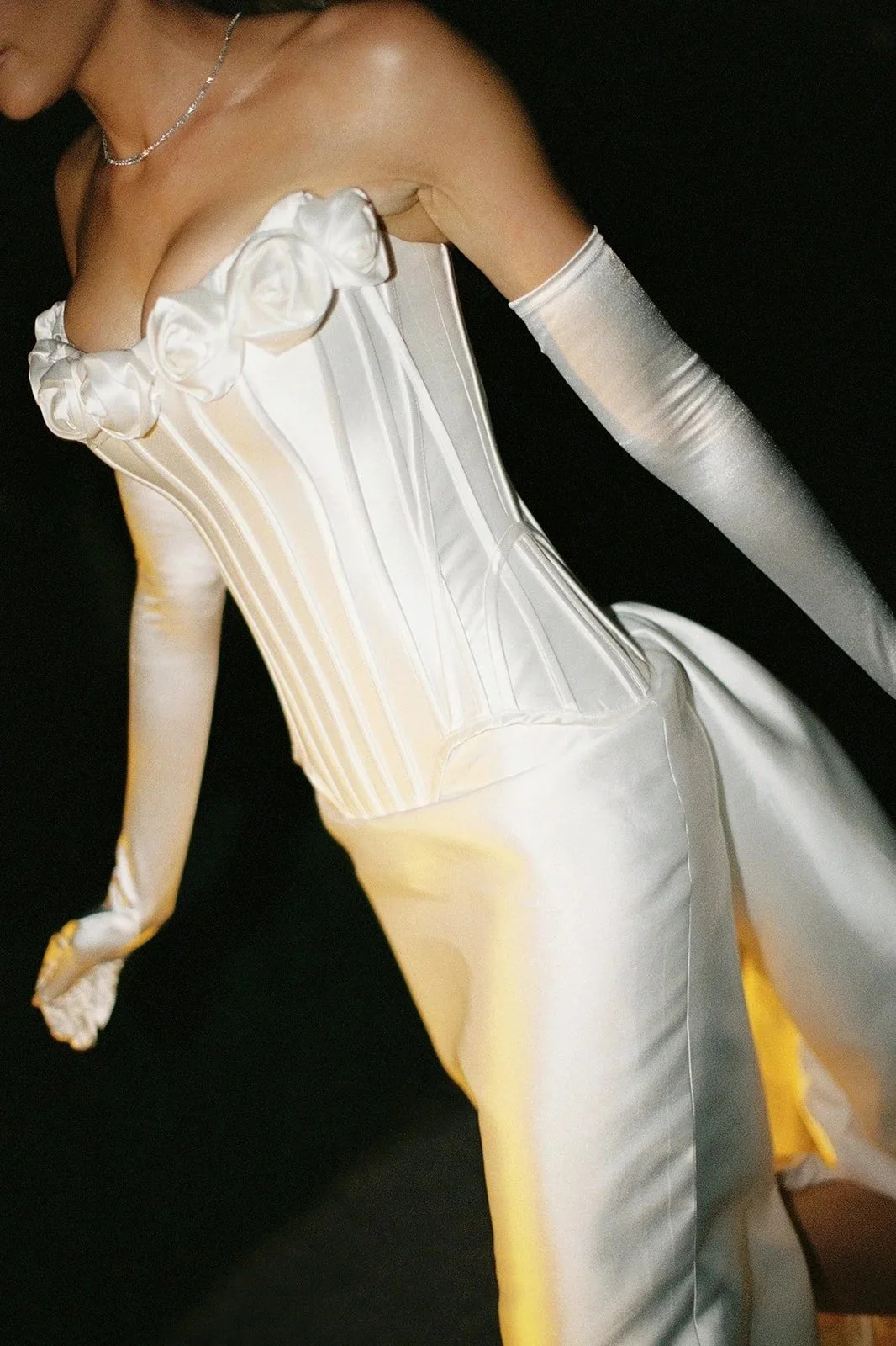 “Our wedding dress code was black tie, and I wore a classic taffeta ballgown with a cat eye neckline and drop waist corset by Sen Studio. The gown felt grand and timeless, which worked beautifully with the venue. I chose a lace trimmed veil to add softness and romance, and wore it with a blusher for a more traditional bridal feel. My second dress was designed with Aston Bridal. I always knew I wanted a full length second look rather than a mini, and I wanted to incorporate roses with a subtle vintage influence. We took inspiration from historical corsetry, with exposed boning and rosette detailing along the neckline.”