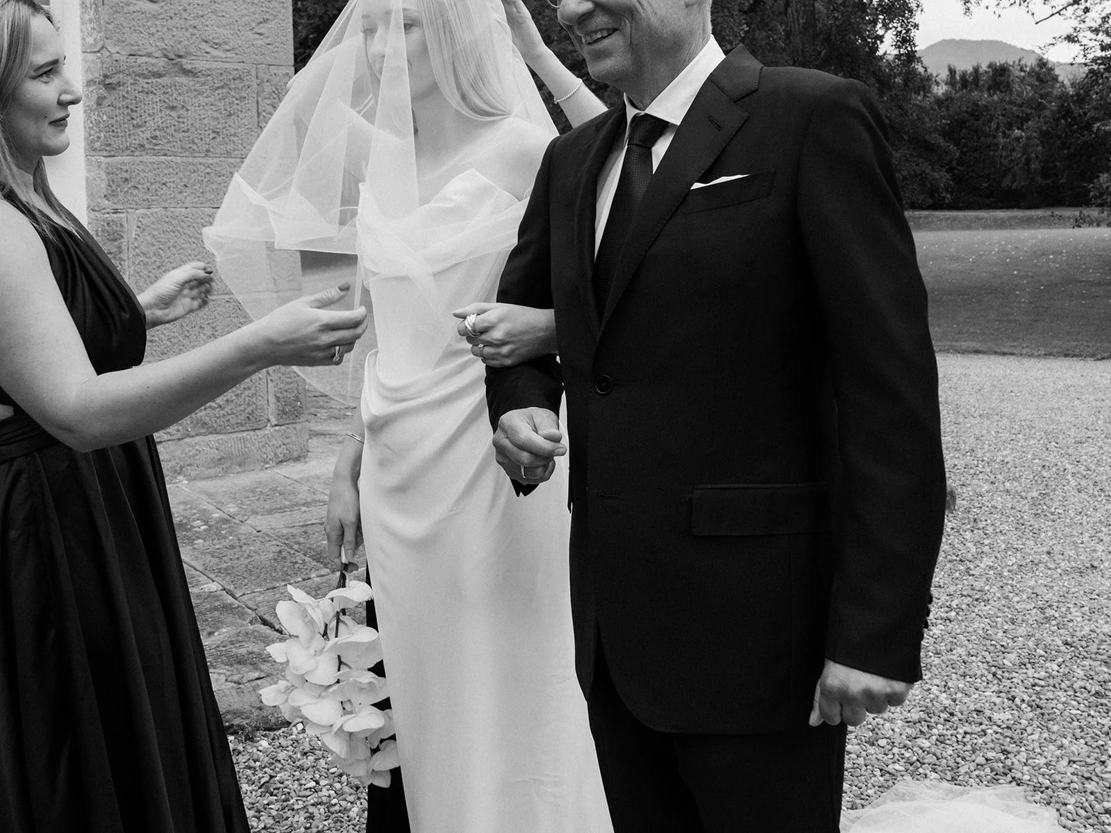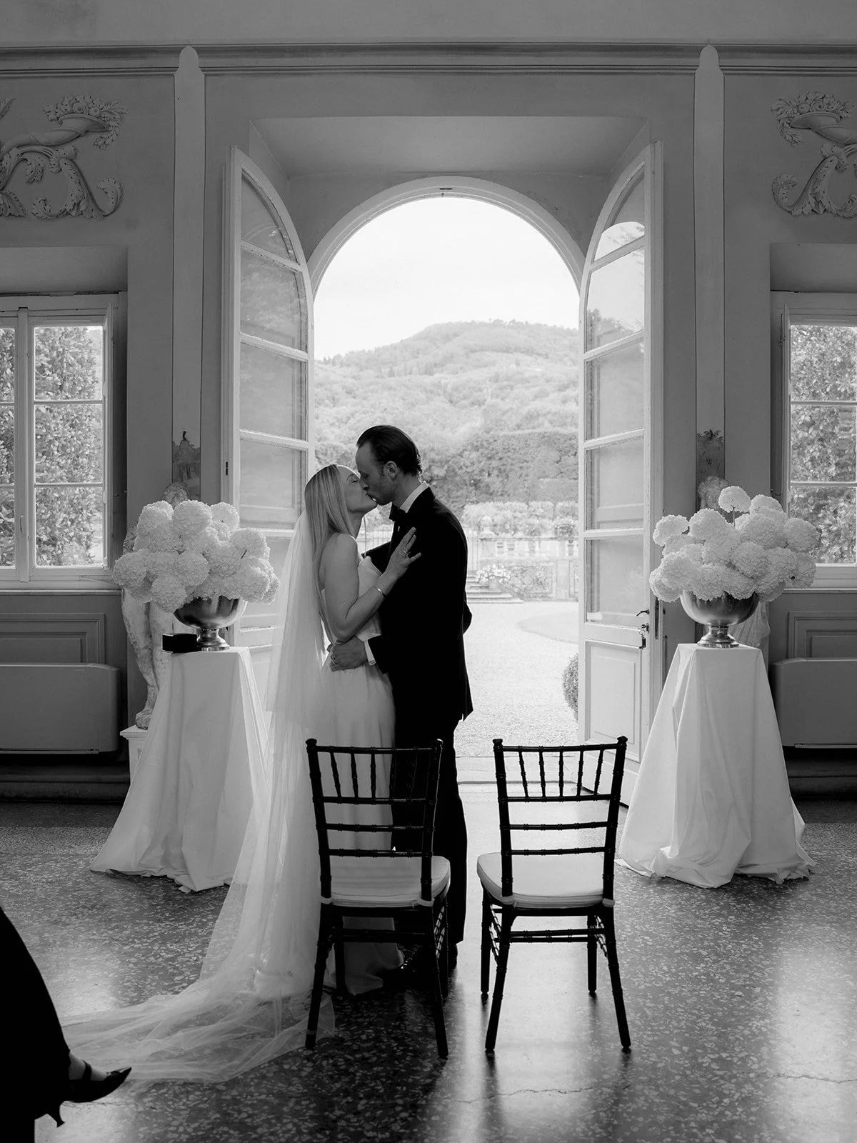 “Our black-tie dress code, the minimalist floral arrangements using just one type of flower, and a very reduced, clean approach to details. Nothing playful — everything intentional and understated made the day feel authentic.”